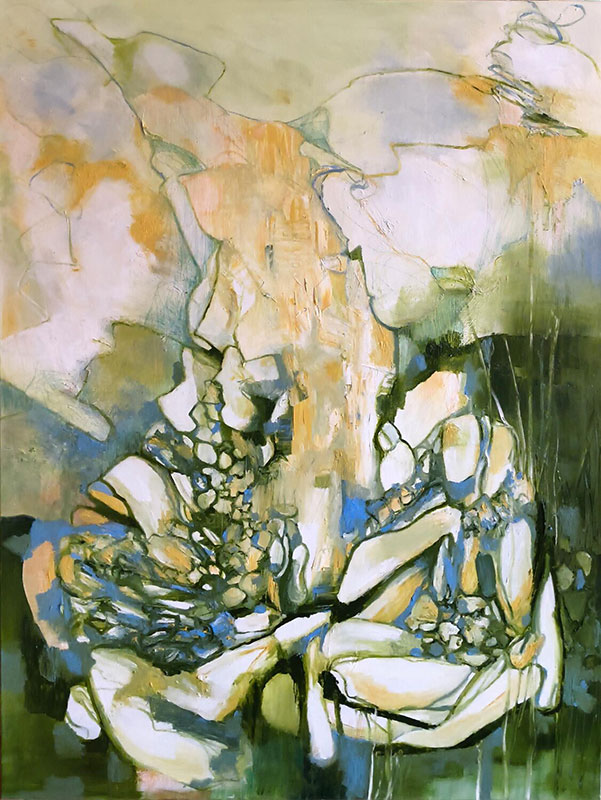 Die gebändigte Farbe auf der Fläche, ist jedoch keine zufällige, willkürliche. Ein bewusster wie intuitiver Gestaltungsprozess, der aus einer Motivwelt schöpft, welche nicht näher und vertrauter sein könnte – der Natur.